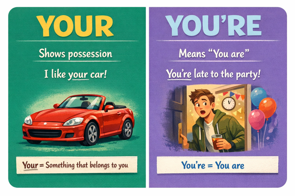 Many learners confuse your vs you’re when writing quickly. Always remember that “your” shows possession, while “you’re” means “you are.” Checking your sentence using the “you are” test can help you avoid mistakes.